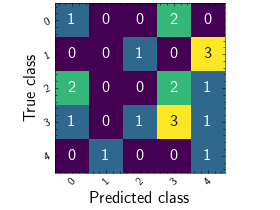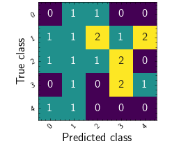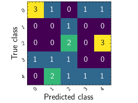 The confusion matrix \(C\) is constructed such that \(C_{i, j}\) is equal to the number of observations known to be in class \(i\) but predicted to be in class \(j\). Thus row indices of the confusion matrix correspond to the true class labels and column indices correspond to the predicted class labels.
