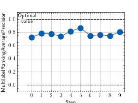>>> from torch import rand, randint >>> # Example plotting multiple values >>> from torchmetrics.classification import MultilabelRankingAveragePrecision >>> metric = MultilabelRankingAveragePrecision(num_labels=3) >>> values = [ ] >>> for _ in range(10): ... values.append(metric(rand(20, 3), randint(2, (20, 3)))) >>> fig_, ax_ = metric.plot(values)